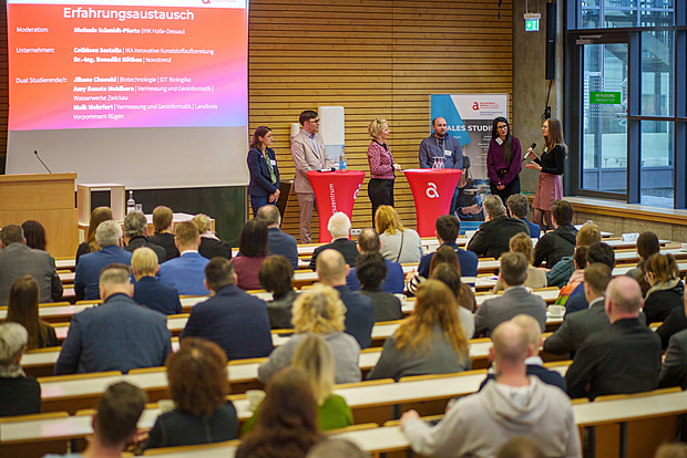Das Interesse an dieser gut etablierten Veranstaltung war erneut sehr hoch. Weit über 100 Teilnehmende aus mehr als 80 Unternehmen haben sich im Audimax der Hochschule Anhalt in Dessau getroffen und die Gelegenheit genutzt, sich über die verschiedenen dualen Studiengänge der Hochschule Anhalt zu informieren. Die Hochschule bietet an ihren drei Standorten Dessau-Roßlau, Köthen und Bernburg duale Studiengänge von Betriebswirtschaft bis Lebensmitteltechnologie an.